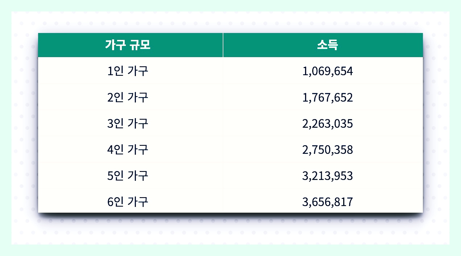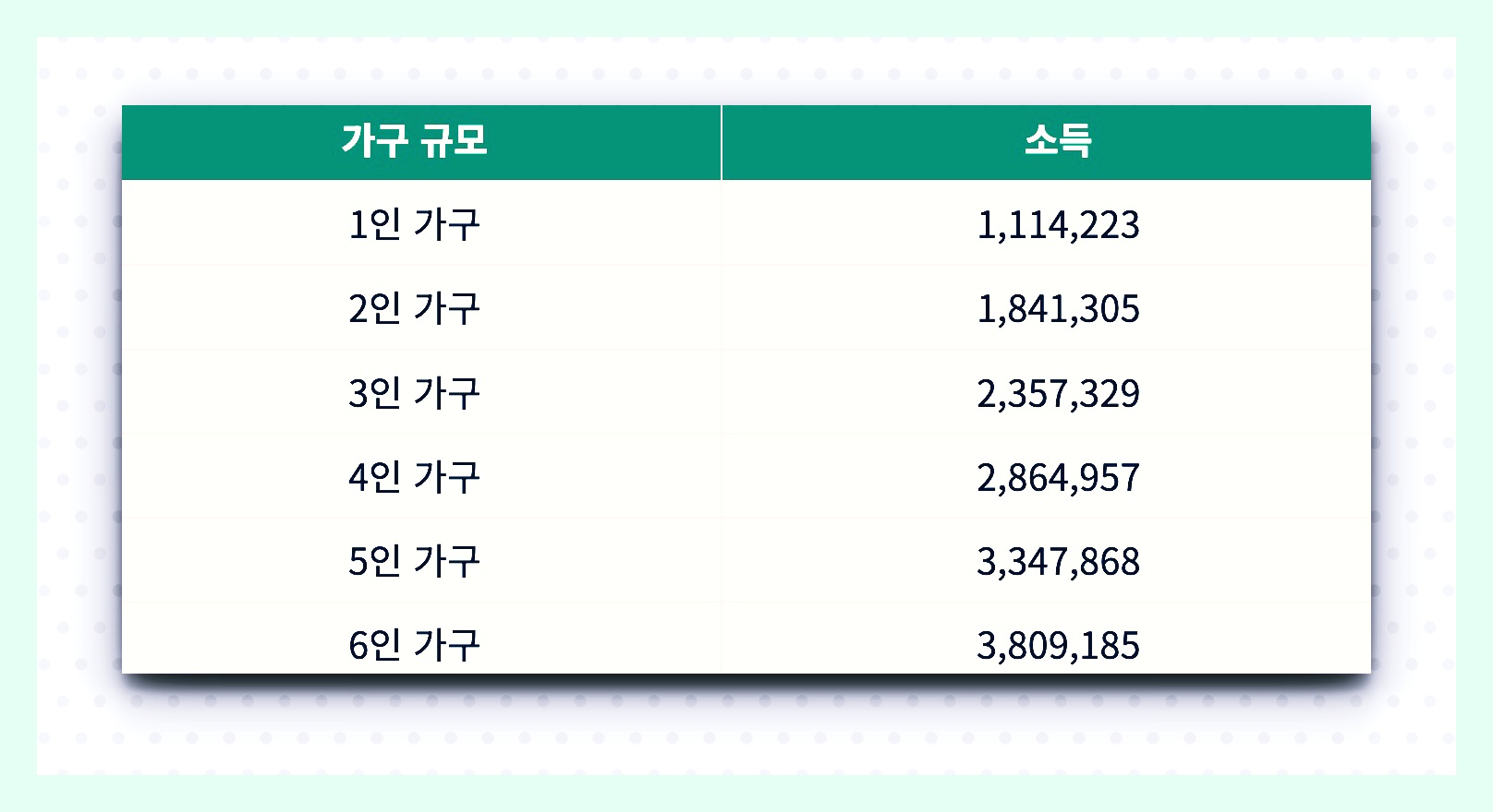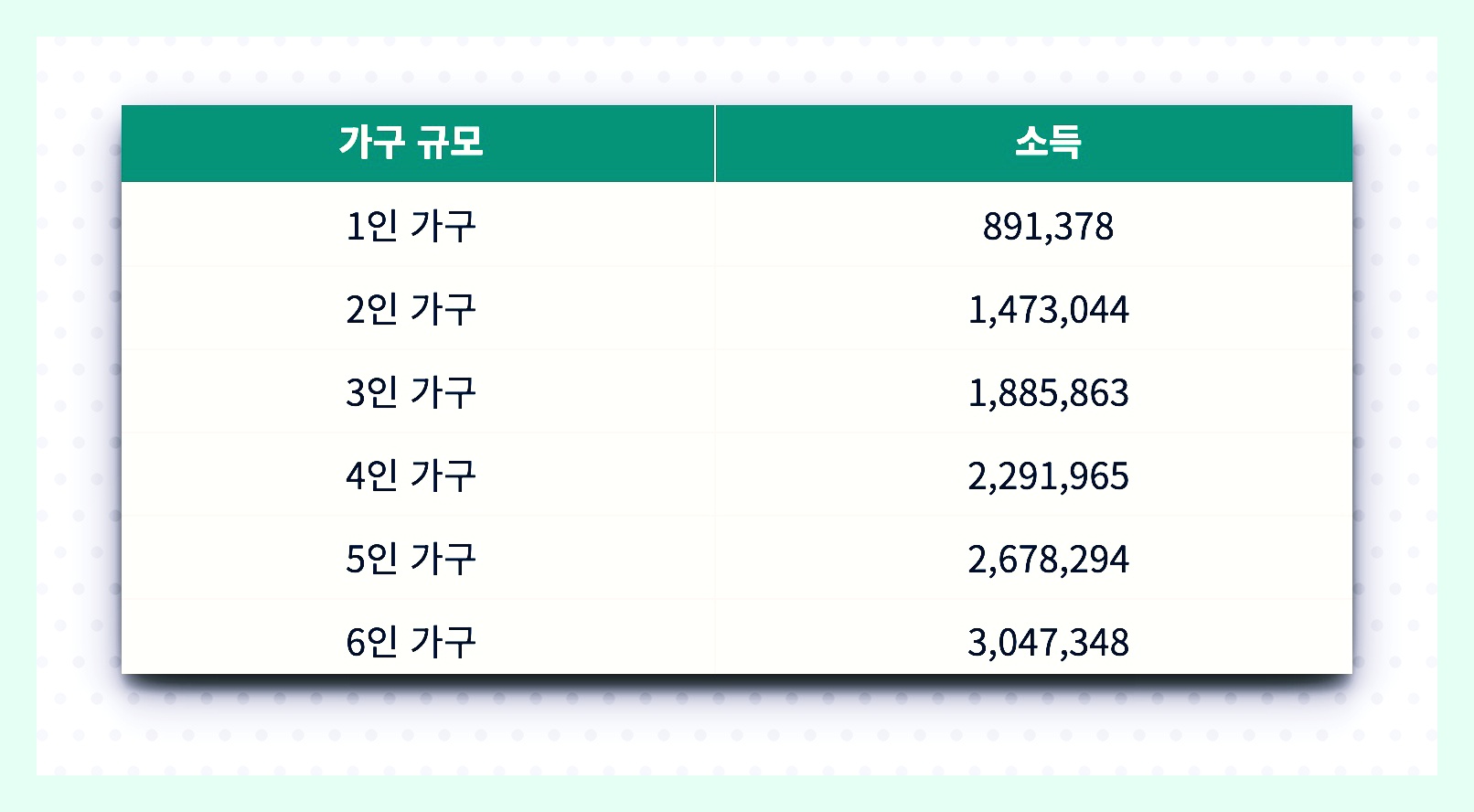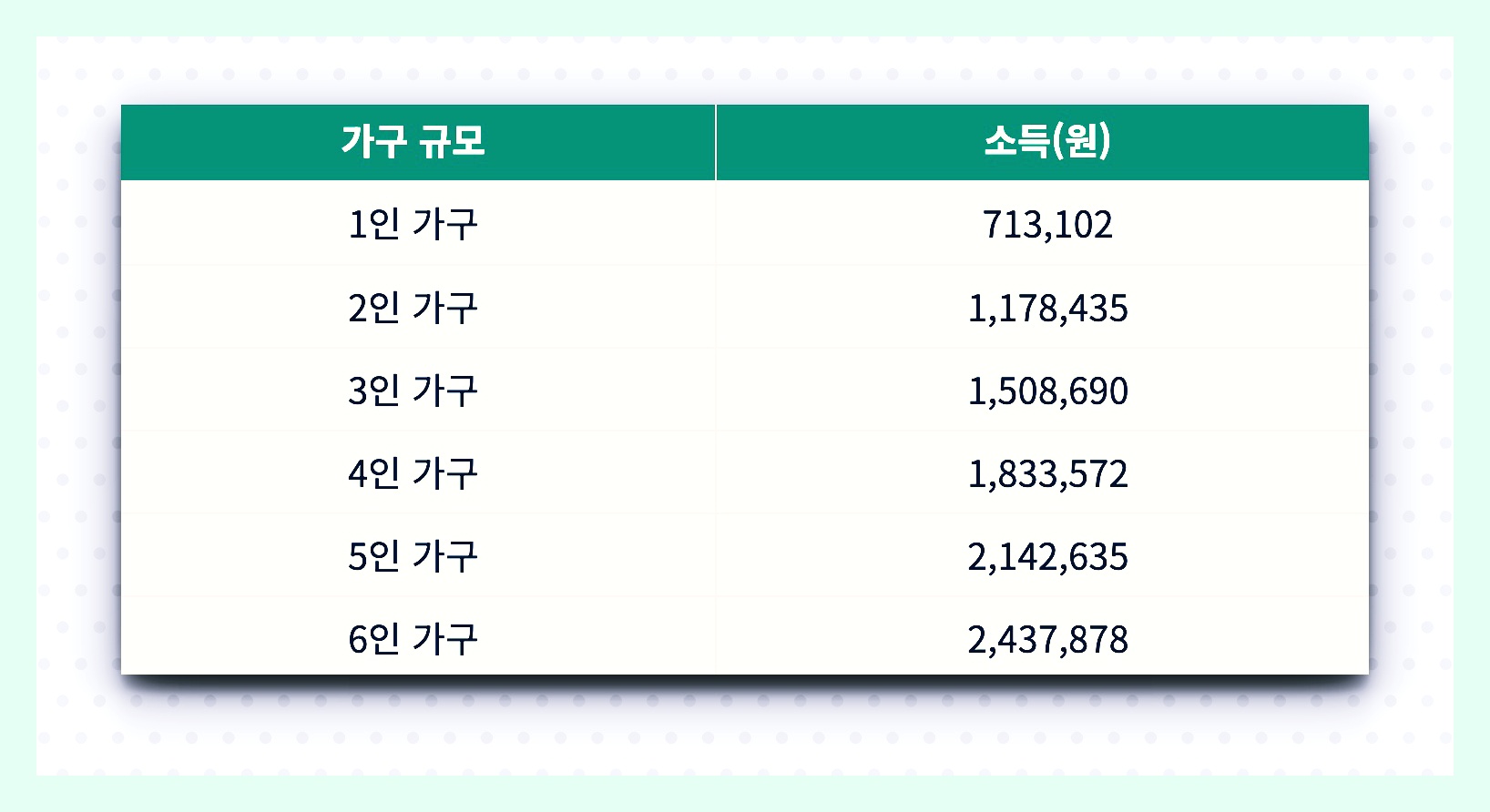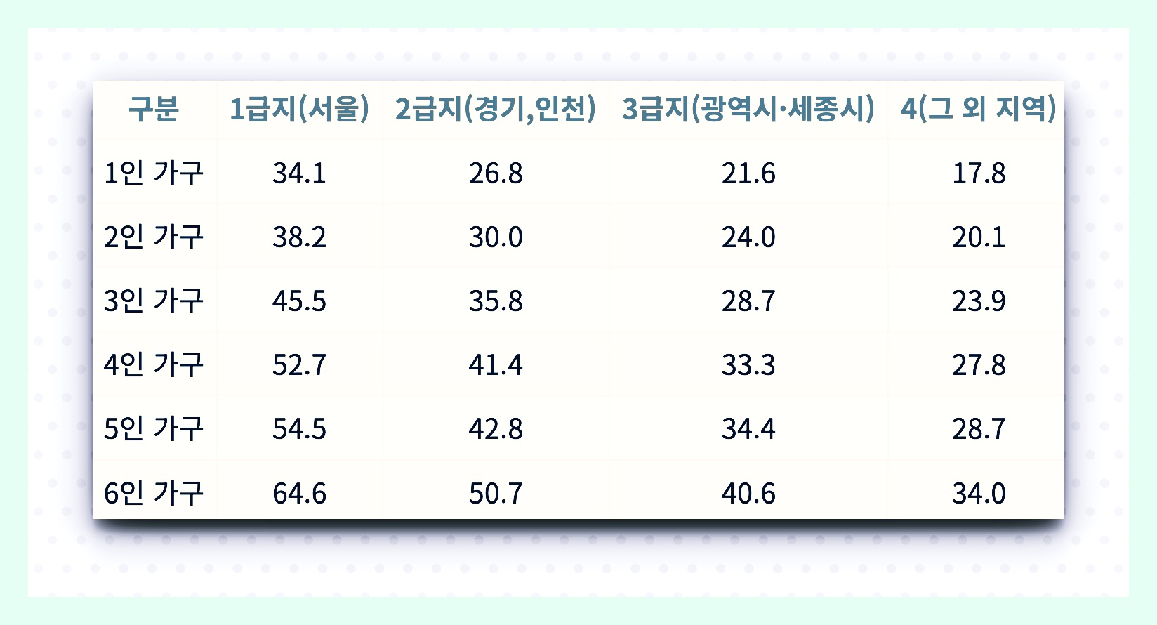 생계 급여: 가구당 소득 인정액이 기준보다 낮을 경우, 차액을 현금으로 지급받습니다. 금액은 약 32만원 내외입니다.