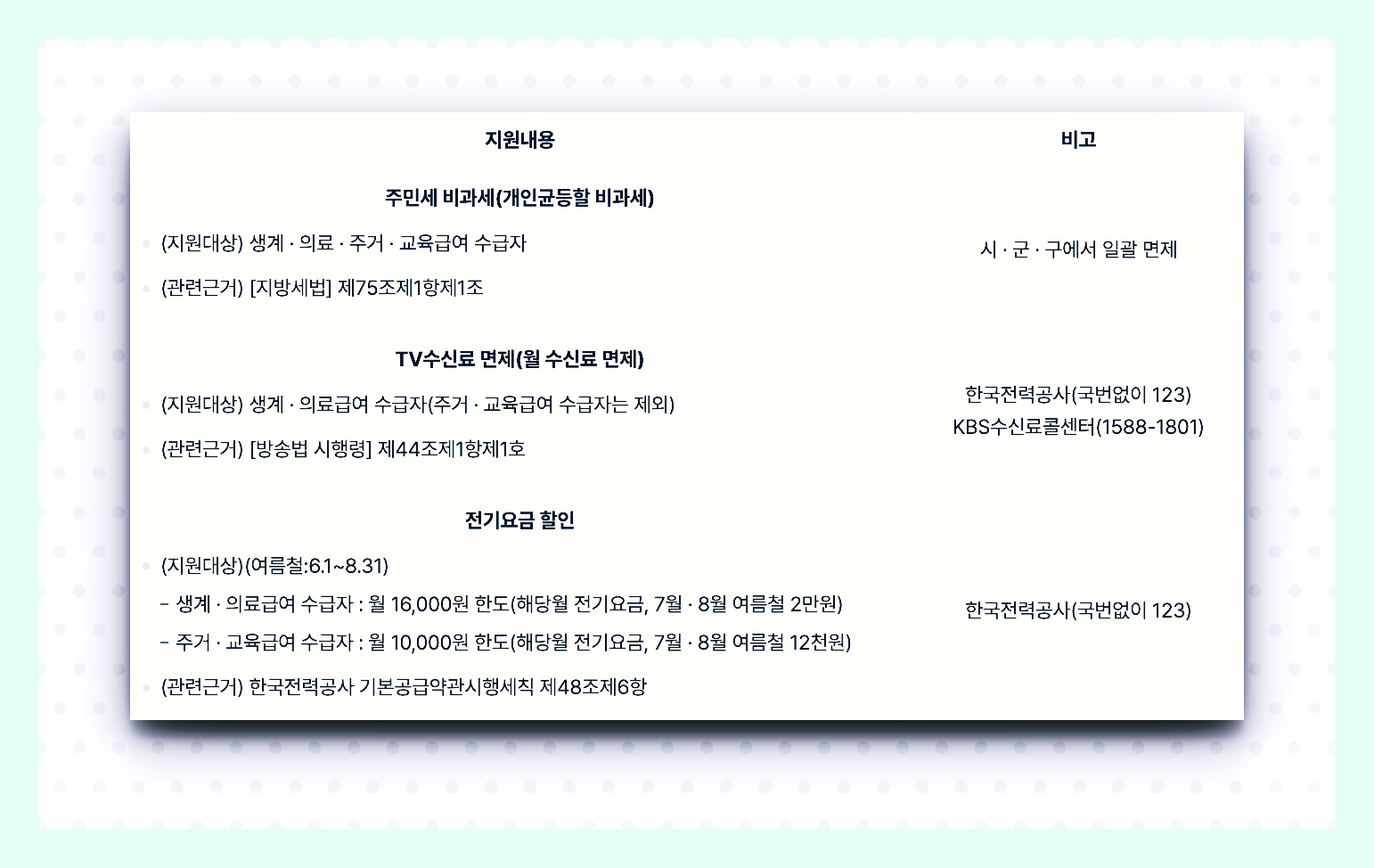기초생활수급자로서 받을 수 있는 혜택은 다음과 같습니다