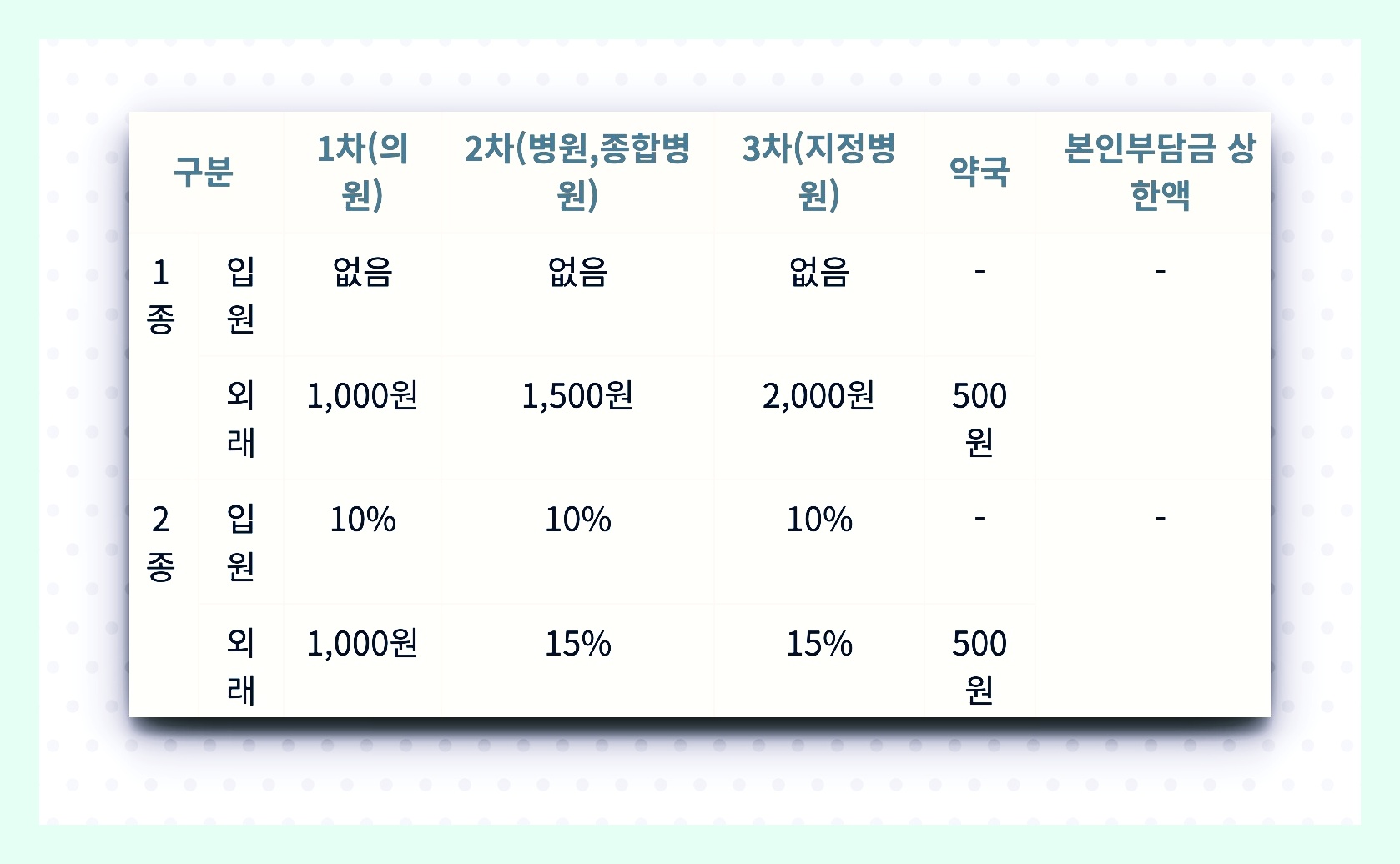 의료 기관 혜택: 본인 부담금을 제외한 전액을 국가에서 지원받을 수 있습니다.